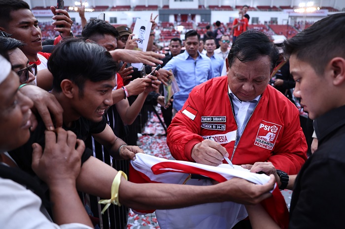 Prabowo disambut teriakan semangat ribuan relawan PSI yang hadir di Stadion Jatidiri, Semarang, Sabtu, (9/12/2023).