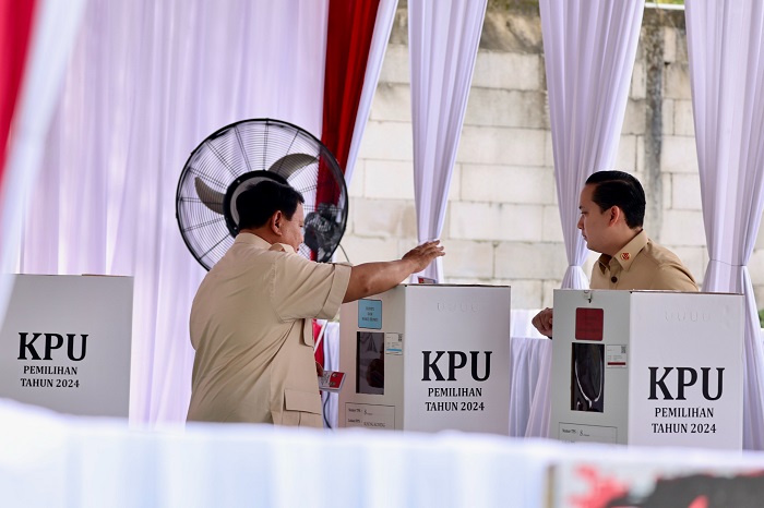 Di balik bilik suara, Prabowo menggunakan hak pilihnya dengan mencoblos kertas surat suara.